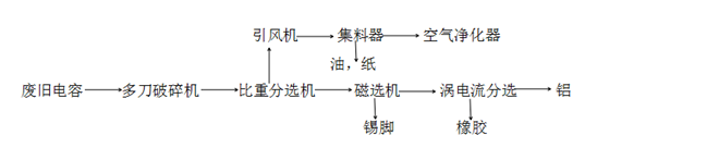 1.多刀破碎機(jī):把廢舊電容進(jìn)行破碎分解; 2.比重分選機(jī):把破碎后的電容進(jìn)行風(fēng)選和比重分選,把油紙分離出來(lái),把鋁、橡膠、電子腳分離出來(lái); 3.磁選機(jī):把比重分選后的物料進(jìn)行磁選,把電子腳磁選出來(lái); 4.渦電流分選機(jī):把鋁和橡膠分離出來(lái)。
