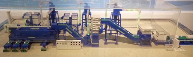 廢銅鋁散熱器再利用生產(chǎn)線采用物理破碎分選再利用方式,首先物料通過一破機(jī)進(jìn)行粗破碎,再到二破機(jī)進(jìn)行粉碎,粉碎成3cm大小的物料經(jīng)過磁選分選出鐵,再到氣流分選中進(jìn)行風(fēng)選。結(jié)構(gòu)新穎,外形美觀、獨(dú)特,產(chǎn)能大;全線由PLC程序控制,一次投料,多機(jī)完成;設(shè)有自動(dòng)停機(jī),超載自動(dòng)報(bào)警裝置。該處理線的成功開發(fā),大大地解放了生產(chǎn)力,提高了金屬的再利用質(zhì)量,同時(shí)又再利用了鐵的優(yōu)點(diǎn),重要地是在處理過程中有效地解決了粉塵的溢出,減少了對空氣的污染。